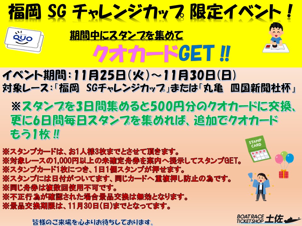 福岡SGチャレンジカップ期間中の、スタンプカードイベントにつきまして、未確定舟券の対象レースを変更いたします。