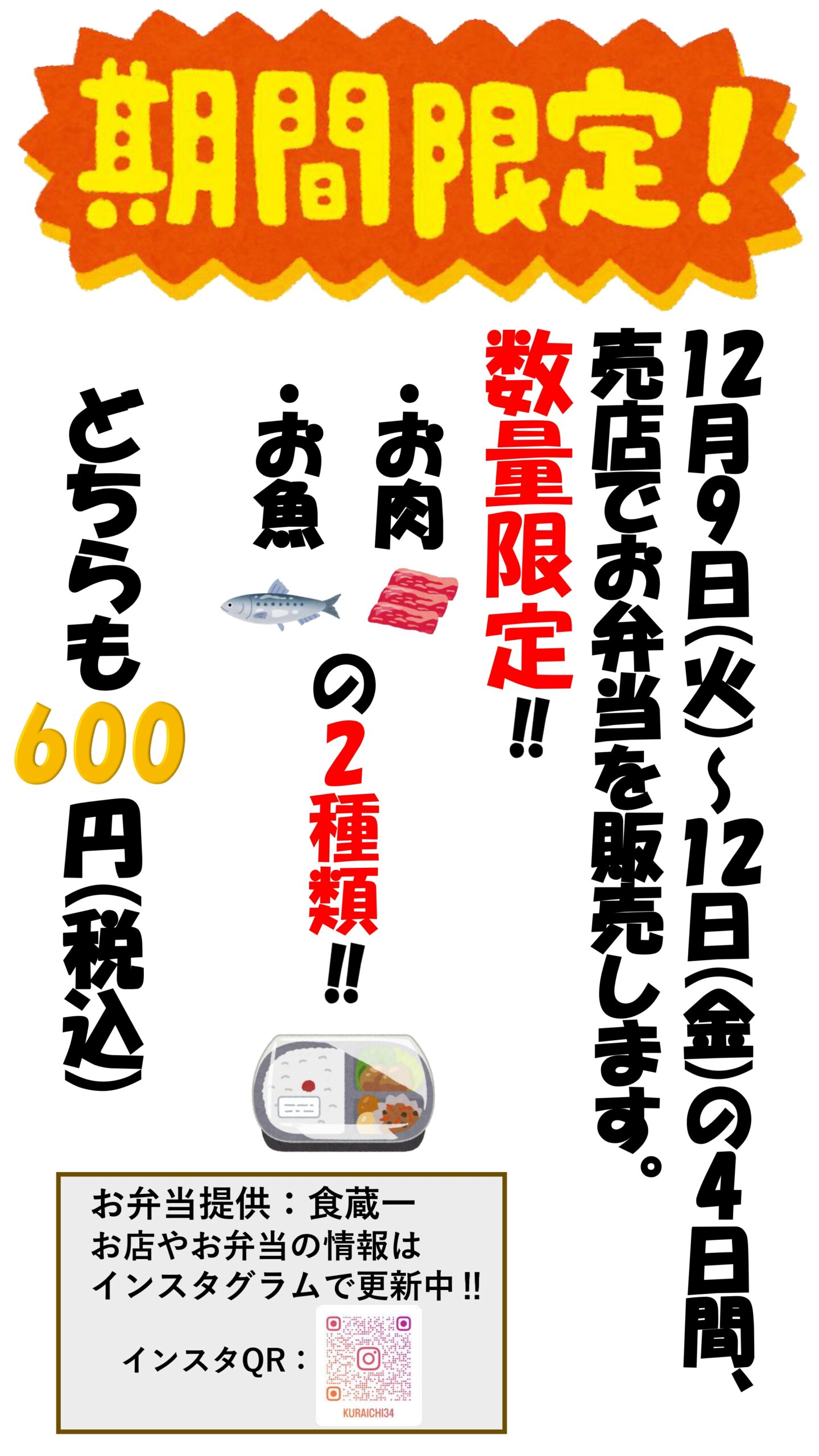 12月9日(火)~12月12日(金)の4日間、売店でお弁当販売をいたします。