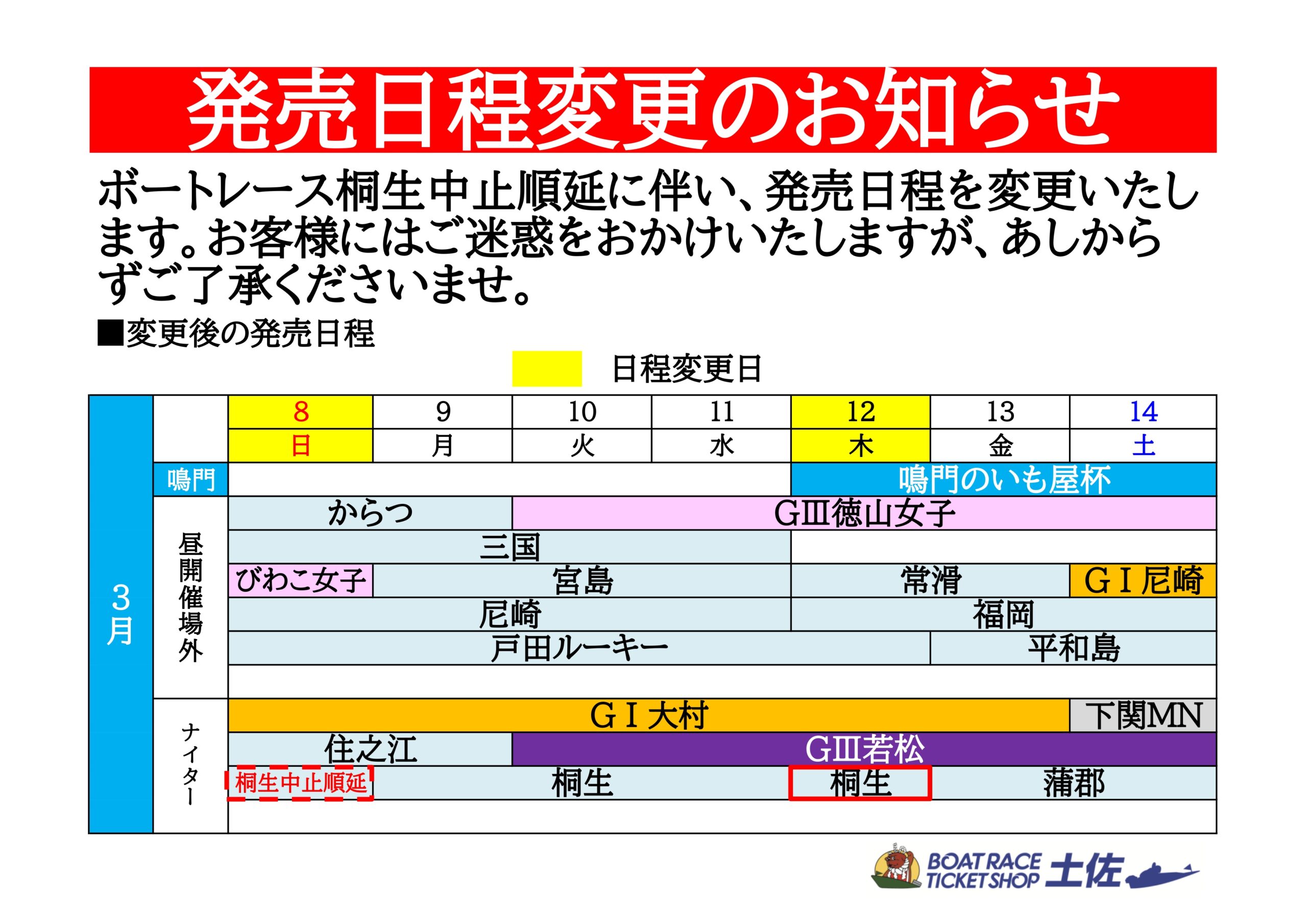 3/8(日)開催のBR桐生の中止順延に伴い、