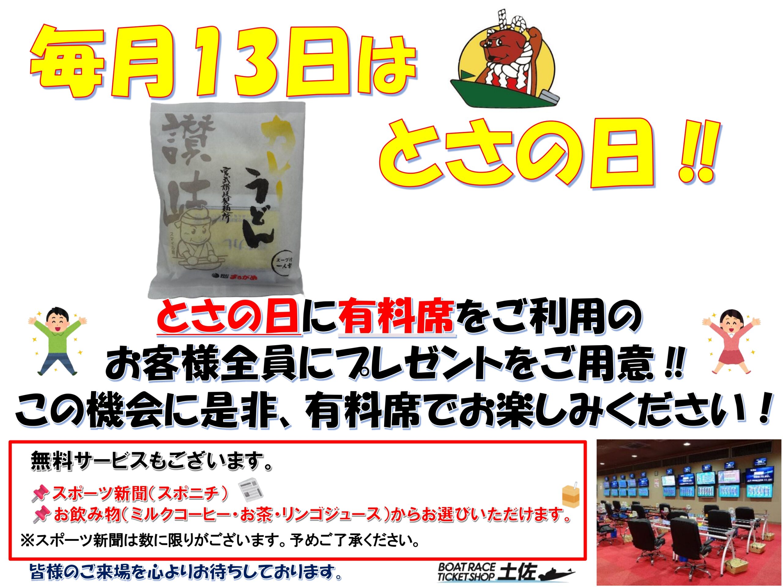毎月13日は、とさの日 とさの日に有料席ご利用のお客様へプレゼントがあります。 この機会に是非、有料席でお楽しみください!